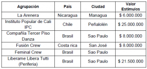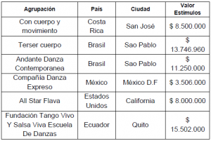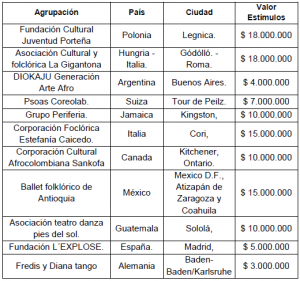 Para el año 2012 Pasantías Colombia-Cuba para Danza: 9 estímulos otorgados. Por $90 millones.