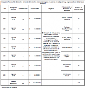 El Ministerio de Cultura ha otorgado 47 becas para la movilidad internacional de creadores, emprendedores e investigadores, a título individual, de las áreas de literatura, libro y lectura, que hayan sido invitados por instituciones a participar en actividades o escenarios de reconocida trayectoria y comprobada calidad, con el fin de intercambiar experiencias, establecer nuevas alianzas y adelantar gestión con sus pares de otros países.