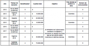 Según el Ministerio de Cultura, para el año 2018 se tienen los siguientes estímulos: