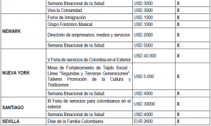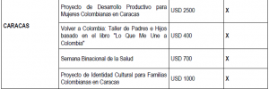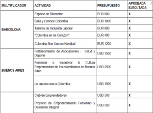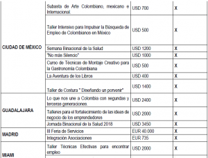 En el siguiente cuadro información acerca de las propuestas presentadas durante el año 2018 por cada uno de los multiplicadores de “Colombia Nos Une” en el exterior, junto con su costo individual: