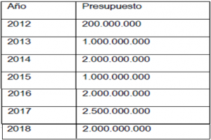 En el siguiente cuadro, la descripción del presupuesto que desde el año 2012 se le ha asignado al Grupo de Colombia Nos Une, para el fortalecimiento de la capacidad institucional para el desarrollo de estrategias para el acompañamiento a los connacionales que retornan al país a nivel nacional: