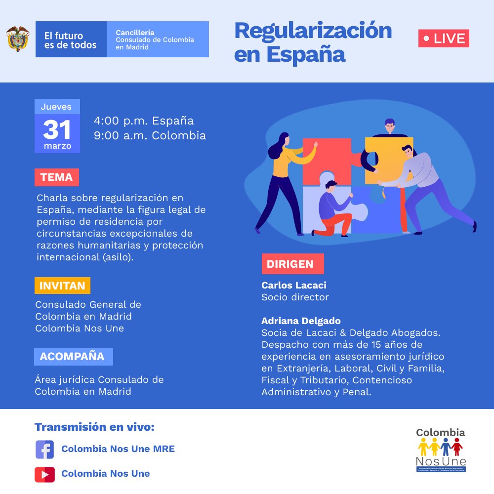 Dándole continuidad al buen trabajo realizado por sus antecesoras, (María Margarita Salas y Gloria María Borrero), el recién posesionado Cónsul de Carrera Diplomática y Consular, Rodrigo Pinzón Navarro, en coordinación con Valentina, Multiplicadora de Colombia Nos Une, y todo el equipo de esa Sede consular, llevarán a cabo una importante charla vía Online sobre «Regularización en España», o lo que es lo mismo, el procedimiento para la obtención de documentos de residencia y trabajo.