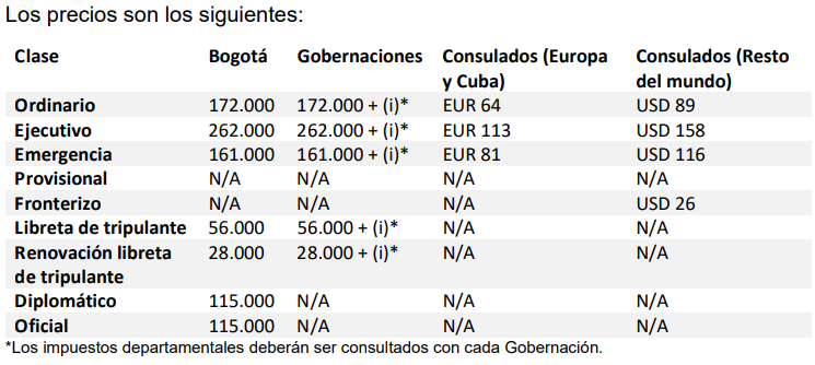 Costo de los pasaportes colombianos en Colombia y el mundo: