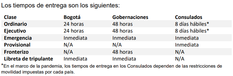 El tiempo de entrega del pasaporte colombiano tanto en el interior de Colombia como en los diferentes Consulados del mundo, es el que se indica en el siguiente cuadro: