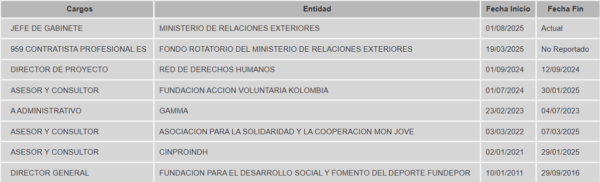 Salvo un cargo como Director General de la Fundación para el Desarrollo Social y Fomento del Deporte «FUNDEPOR» entre el año 2011 y 2016, los demás puestos o trabajos realizados por el mencionado Iván Domínguez, se han originado hasta el día de hoy en el Ministerio de Relaciones Exteriores, y casualmente desde que la Sra. Rosa Yolanda Villavicencio Mapy asumió como Canciller colombiana, tal y como lo pueden observar en el siguiente cuadro: