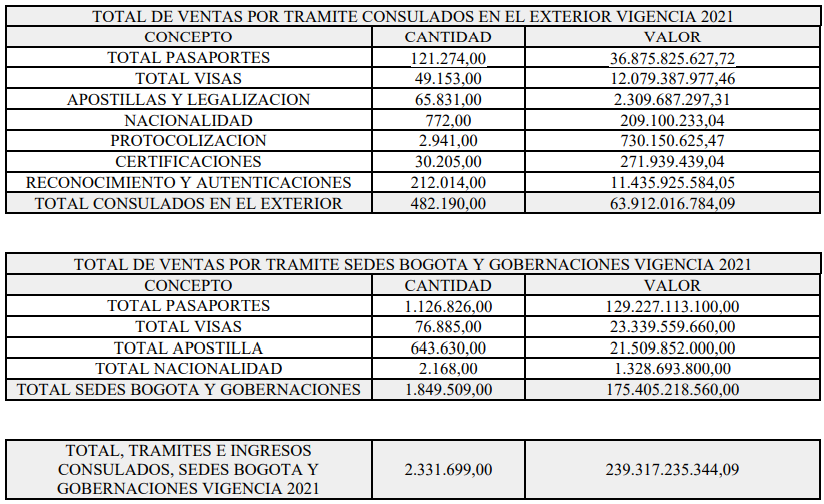 Para el pasado 2021 ascendió a TREINTA Y SEIS MIL OCHOCIENTOS SETENTA Y CINCO MILLONES, OCHOCIENTOS VEINTICINCO MIL SEISCIENTOS VEINTISIETE ($36.875.825.627) PESOS, equivalente a 121.274 pasaportes expedidos en los diferentes Consulados colombianos en el mundo.