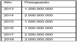 En el siguiente cuadro el presupuesto asignado a Colombia Nos Une desde el año 2013, para el fortalecimiento de políticas públicas para la vinculación y atención de colombianos en el exterior: