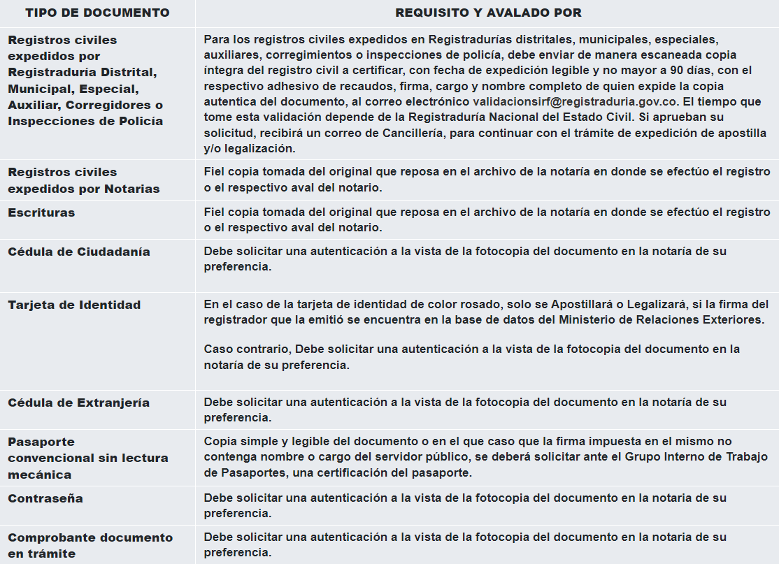 1. Todos los documentos deben contener nombre, cargo, entidad, fecha y firma manuscrita de un servidor público o de un particular en ejercicio de funciones públicas. Firma que debe encontrarse registrada en la base de datos del Ministerio de Relaciones Exteriores (Resolución 1959, Articulo 7, numeral 4). Verifique los requisitos que debe reunir el documento para apostillar y/o legalizar. Los requisitos varían de acuerdo con el tipo de documento. Ingrese a la sección de requisitos de Apostilla o Legalización en: www.cancilleria.gov.co/apostilla-legalizacion para ver toda la información.