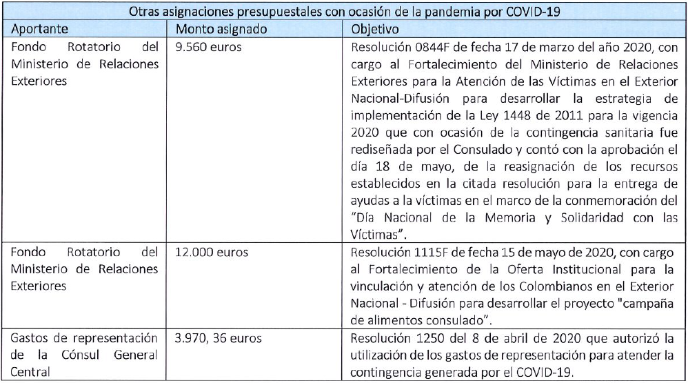 Sin retractarnos de los hechos denunciados en nuestro artículo del 24 de Mayo del año en curso (Visible aquí), tenemos que decir en esta ocasión, con las versiones dadas por un buen número de ciudadanos que han sido atendidos durante este tiempo de pandemia en el Consulado de Madrid – España, más los informes que hemos recibido mes a mes de esta Sede consular, que se ha hecho un trabajo muy bueno. Tan bueno que no solo ha operado con el irrisorio presupuesto de 32.600€ asignado para esta situación por el Gobierno colombiano a través del Ministerio de Relaciones Exteriores – «Fondo Especial para las Migraciones», sino que gracias a las gestiones de la Sra. Cónsul Borrero, de la actual Multiplicadora de «Colombia Nos Une» María Alejandra López, quien tomó posesión de ese cargo el 09 de mes de Marzo del año en curso, cuando recién comenzaba el confinamiento por la pandemia en la ciudad madrileña, se consiguieron los ingresos relacionados en el siguiente cuadro: