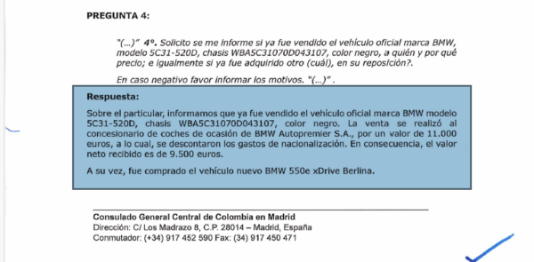 La Cancillería «obedeció», y autorizó comprar ese «nuevo y millonario juguetito», pues así lo hizo saber Higuera Ángel bajo radicado S-CESMD-25-000541, del pasado 17 de octubre, y cuyo pantallazo de la respuesta en general pueden ver en la siguiente imagen, en donde no solo confirma la venta del vehículo oficial del Consulado, sino que agrega con claridad que, «A su vez, fue comprado el vehículo nuevo BMW 550e Drive Berlina».
