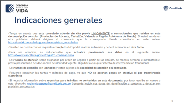 En la conversación con la Sra. Gillian Maghmud le hicimos igualmente la observación sobre la información equivocada que apreciábamos en la pág. web de ese Consulado, donde se obliga a los ciudadanos a que se registren o actualicen sus datos en el Registro consular para la realización de sus trámites, al igual que niega la atención para cualquier trámite a los colombianos que no residan en su jurisdicción, pero por lo visto le importó lo mismo. – Ver siguiente imagen tomada de la web del Consulado colombiano en Valencia, hoy 23 de agosto de 2023, a las 13:00 hora española: