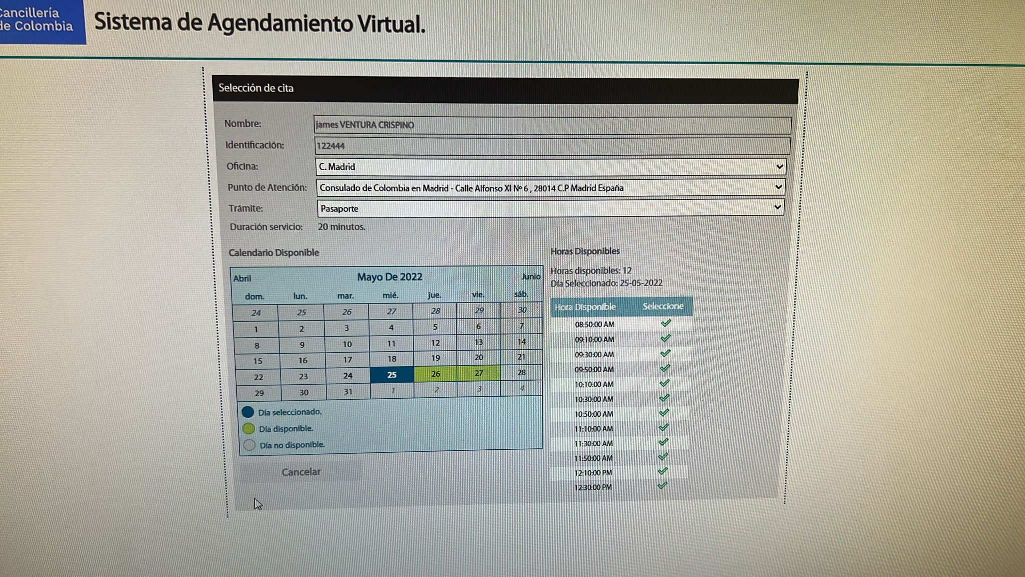 «Nuestros connacionales pueden agendar citas para realizar los trámites de certificaciones/constancias, tarjetas de identidad (por primera vez, renovación duplicado o rectificación), cédula de ciudadanía (por primera vez, renovación duplicado o rectificación), pasaportes, reconocimientos de firma (en documento privado, y para la autorización de salida de menores de edad), y registros civiles de nacimiento, matrimonio y defunción, a través de la página web https://madrid.consulado.gov.co/ durante todos los días de la semana y las 24 horas, por medio del Sistema de Agendamiento Virtual de citas del Ministerio de Relaciones Exteriores.» (Resaltado fuera de texto), sin embargo nos indica más adelante el mismo Consulado que «el Sistema de Agendamiento Virtual de citas del Ministerio de Relaciones Exteriores se habilita para tomar citas para ser atendido presencialmente en este Consulado, semanalmente, es decir, cada miércoles de la semana se abren las citas para la siguiente semana, y así, sucesivamente.