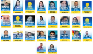 En la siguiente imagen los 26 candidatos elegidos como Representantes a la Mesa Piloto, detallando votos y porcentaje dentro de la respectiva área de votación (Continente, subcontinente, inmigrantes en Colombia y retornados)