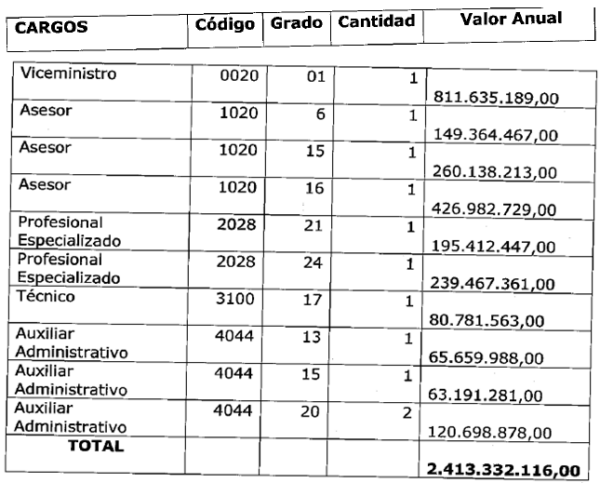 «Finalmente, se precisa que, a la fecha de la presente respuesta, no se cuenta con personal efectivamente vinculado al Viceministerio de Asuntos Migratorios, Consulares y Protección Internacional, en razón a que el proceso de provisión de los empleos se encuentra en trámite; por lo tanto, no es posible reportar costos reales de nómina distintos a los valores proyectados para los cargos antes mencionados».