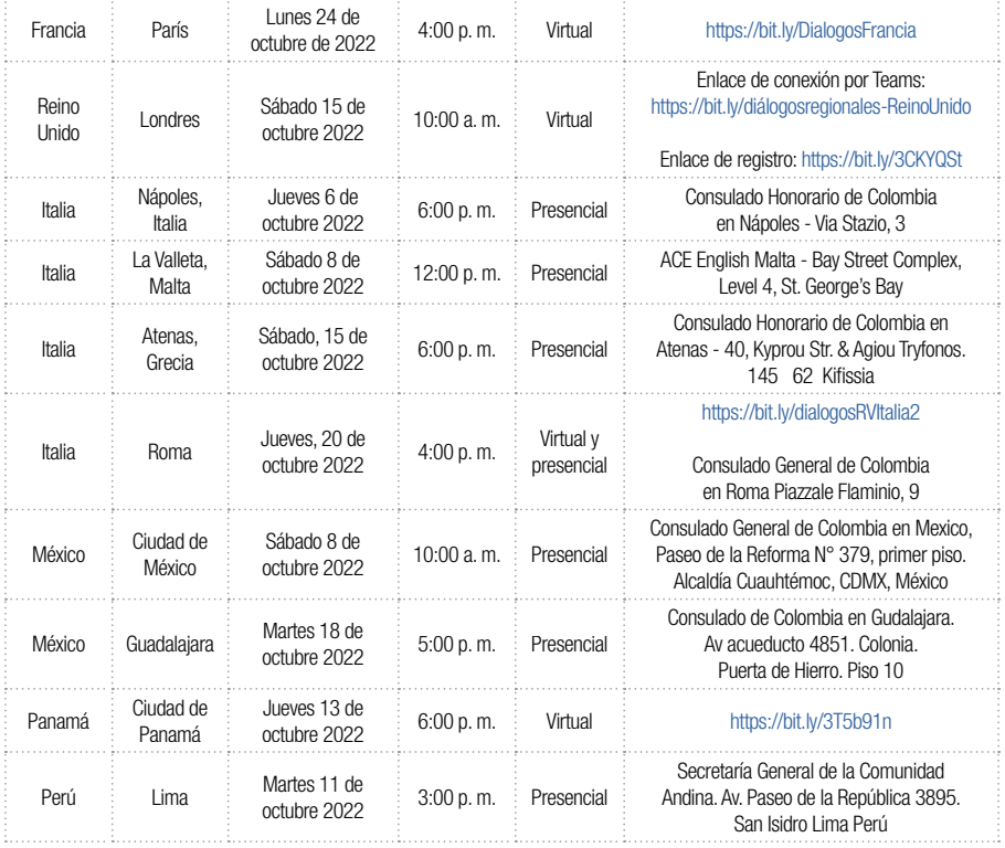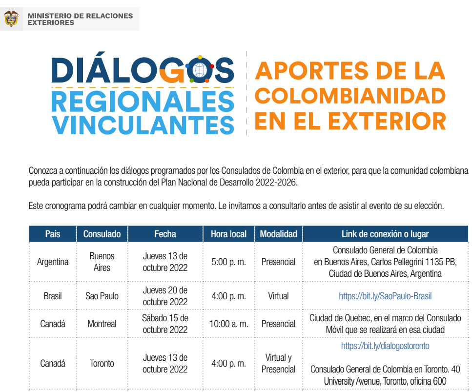 Bien sea en el siguiente cuadro, o ingresando aquí, conozcan los diálogos programados por unos pocos Consulados de Colombia en el exterior, para que la comunidad colombiana pueda participar en la construcción del Plan Nacional de Desarrollo 2022 – 2026.
