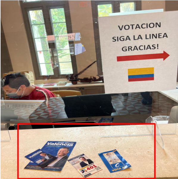 Estos vacíos han sido aprovechados por algunos inescrupulosos políticos y/o seguidores de estos para hacer de las suyas, tal y como está ocurriendo en el Consulado colombiano en Miami – EE.UU., donde el propio Representante actual a la Cámara por la Circunscripción Internacional, y aspirante a ser reelegido en esa misma Curul en las elecciones que para el Congreso se llevan a cabo en el exterior entre el 07 y 13 de marzo, ha acomodado muy plácida y descaradamente su «chiringuito» o puesto de campaña en las propias narices de la sede Consular en dicha ciudad norteamericana, donde no solo reparte su publicidad, sino que aconseja a los ciudadanos a votar por él, como «el de Uribe en el exteri», tal y como se puede ver en la imagen de portada de este artículo, y en la siguiente: