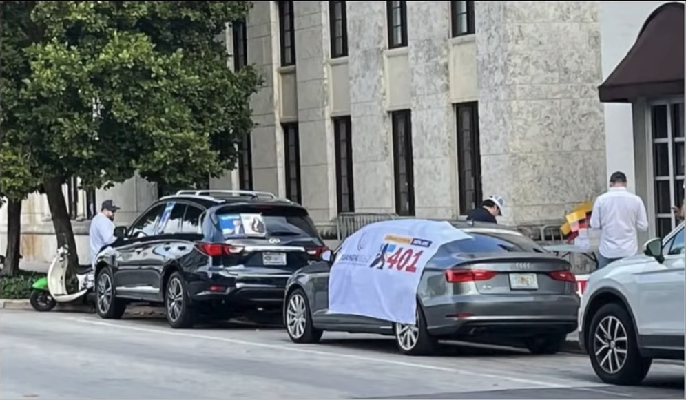 Pero no contento con montar su «Tienda de campaña política» muy cerca del Consulado en Miami, continuamente caminaba unos pasos para entrevistarse en las propias puertas de esa entidad con funcionarios de la misma, queriendo demostrar su poder y relación cercana con estos, algo que bien puede hacer mella en la decisión de los electores. (Ver siguiente imagen).