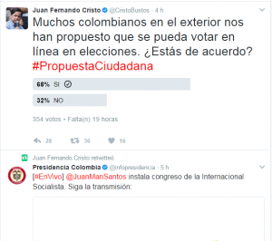 El Sr. Ministro del Interior colombiano, Juan Fernando Cristo, a través de su Twitter ha lanzado esta encuesta para que los colombianos en el exterior apoyen o rechacen esta iniciativa.
