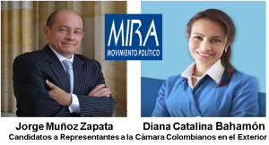 En cuanto al Partido político MIRA, tenemos a tres candidatos, del que uno de ellos, Jorge Muñoz Zapata, ya es «viejo» conocido, no solo por su obra social repartiendo comida en barrios marginados de Queens en EE.UU., sino porque durante dos (2) meses en la pasada legislatura ocupó temporalmente la curul de Representante a la Cámara por los colombianos en el exterior, en reemplazo de su compañera Ana Paola Agudelo, quien estuvo durante ese tiempo de baja por maternidad. Tanto a Jorge Muñoz, como a Diana Catalina Bahamón Morales quien es también candidata por esa lista, y que reside en España, les hemos enviado nuestro invitación y puesto a disposición esta página y nuestros espacios en las redes sociales, para que previa coordinación nos den a conocer detalladamente sus perfiles y propuestas electorales. A quien no hemos podido localizar, es al otro candidato por esa lista, Diego Enrique Riaño León.