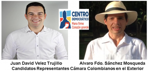 El Centro Democrático, lanzó como candidatos para esta curul en el exterior, a Juan David Velez Trujillo, y Alvaro Fernandez Sanchez Mosqueda. El primero vive en Miami – Estados Unidos, Profesional en Relaciones Internacionales y Ciencias Políticas de la Florida International University. Especializado en seguridad nacional y estudios de Latinoamérica y el Caribe. Maestría en Seguridad y Defensa de la Escuela Superior de Guerra. Candidato al Senado por el Centro Democrático, fundador de este partido y ha trabajado en la UTL de esta bancada en el Senado de la República. Se puso en contacto con nosotros a través de twitter anunciando que pronto nos contactará para darnos a conocer mas en detalle su biografía y propuestas electorales; mientras que el segundo, residente en Venezuela, a pesar de nuestra invitación, no ha dado señales.