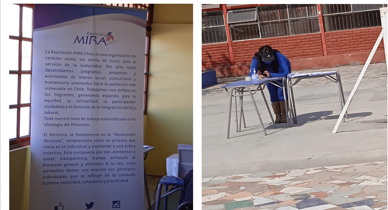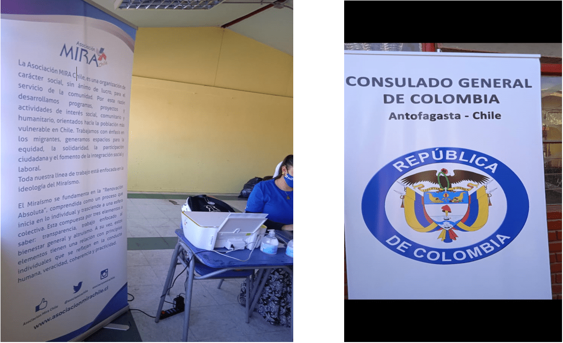 Los días 23, 24, y hoy 25 de Junio, el Consulado de Antofagasta en la República de Chile, organizó un «Consulado Móvil», para llevar a los colombianos residentes en esa localidad los servicios que suelen prestar estos, pero curiosa y sospechosamente en el lugar donde se está llevando a cabo se han visto algunas vallas o pendones promocionando a la tal Asociación MIRA; pero además, con funcionarios o «voluntarios» de dicha Organización atendiendo público, tal y como lo pueden apreciar en las siguientes imágenes. Aparte de coadyuvar con asuntos logísticos, como la impresión de documentos y otros, que bien podrían ser realizados por funcionarios o trabajadores del Consulado, estos «voluntarios» invitan a los usuarios a inscribirse también en su ONG, o lo que vendría siendo lo mismo, a su Partido político, pues no olvidemos que eso en realidad es un solo «paquete», o sea el mismo gancho, ya que la Asociación puede atraer electores para el partido, y el partido atraer voluntarios para la Asociación, e incluso para su otro fortín como es la Iglesia cristiana de donde en realidad provienen los dos (Partido y Asociación).