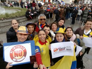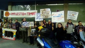 Desde los primeros días del mes de enero, un grupo de colombianos en la ciudad de Madrid – España, pertenecientes a la «Mesa Migraciones Madrid», con la participación de «COLEXRET», al ser conocedores que el Gobierno de nuestro país elevaba nuevamente el Impuesto de Timbre Nacional en los trámites que se realizan ante los Consulados, quedando asi en un 40% sobre el costo de estos, decidieron emprender una campaña popular, a fin de que nuestros compatriotas residentes fuera del país, manifestaran su inconformismo ante esta nueva injusticia, a través de manifestaciones pacíficas frente a los Consulados colombianos en el mundo.