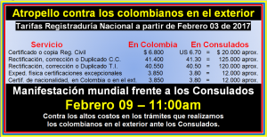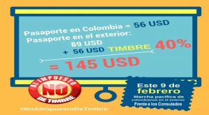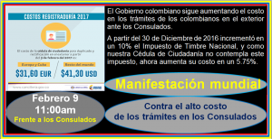 La sociedad civil colombiana en el exterior informa a la opinión pública y medios de comunicación que el jueves 9 de febrero de 2017 a las 11:00am (hora local), se convoca a la comunidad colombiana residente en el exterior para concentrarse frente a los consulados de Colombia en el mundo, para manifestar su inconformidad por el aumento del Impuesto de Timbre Nacional que eleva los costos de los trámites consulares e incremente el valor del pasaporte en el exterior en mas de un 40%.