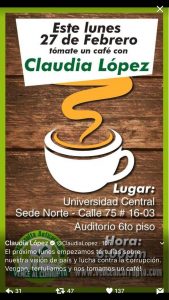 Francisco Caballero Bejarano, fundador y director de la Organización cultural Estudio40, reconocido organizador de eventos culturales autofinanciados, en España, Colombia y otros países del mundo; integrante del grupo de colombianos «Mesa Migraciones» de Madrid – España, asistió en el día de ayer al Conversatorio «Consulta Anticorrupción», realizado en las instalaciones de la Universidad Central (Sede Norte), en la ciudad de Bogotá – Colombia, con la ponencia principal de la Representante a la Cámara Claudia Lopez, promotora de la Consulta popular contra la corrupción en nuestro país.