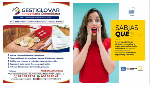 Nos dice igualmente «GESTIGLOVAR» que «Si la intención es adquirir vivienda, en Colombia, en nuestras oficinas le presentaremos los proyectos que tenemos disponibles de acuerdo al perfil de cada cliente. Para esto, nuestra Compañía cuenta actualmente con más de 150 propiedades en todo el territorio colombiano, incluyendo viviendas nuevas, usadas y/o en construcción (Casas y apartamentos); además de lotes en condominios campestres, locales comerciales, bodegas, etc.»